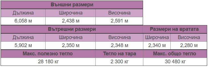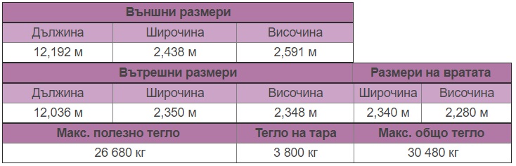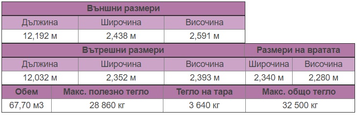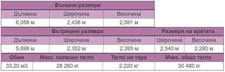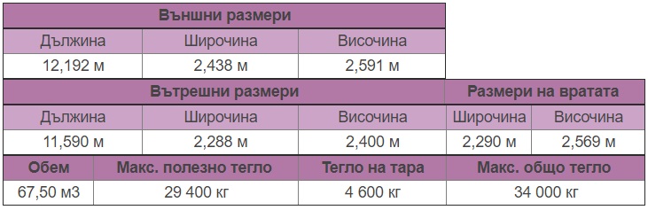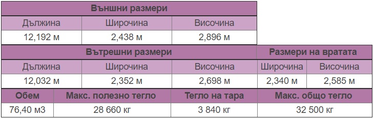 Използва се за всички видове генерални товари. Приема се за 2 TEU. Обозначава се с 40’DV. |